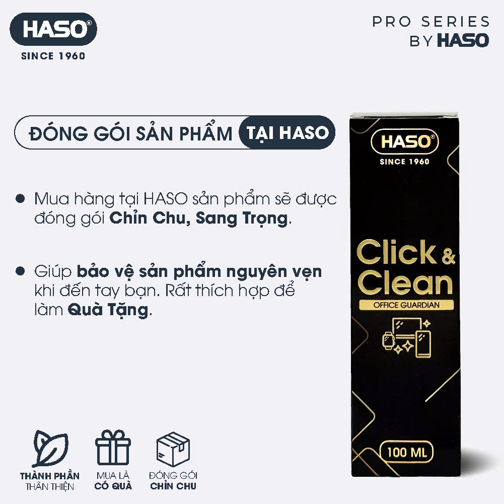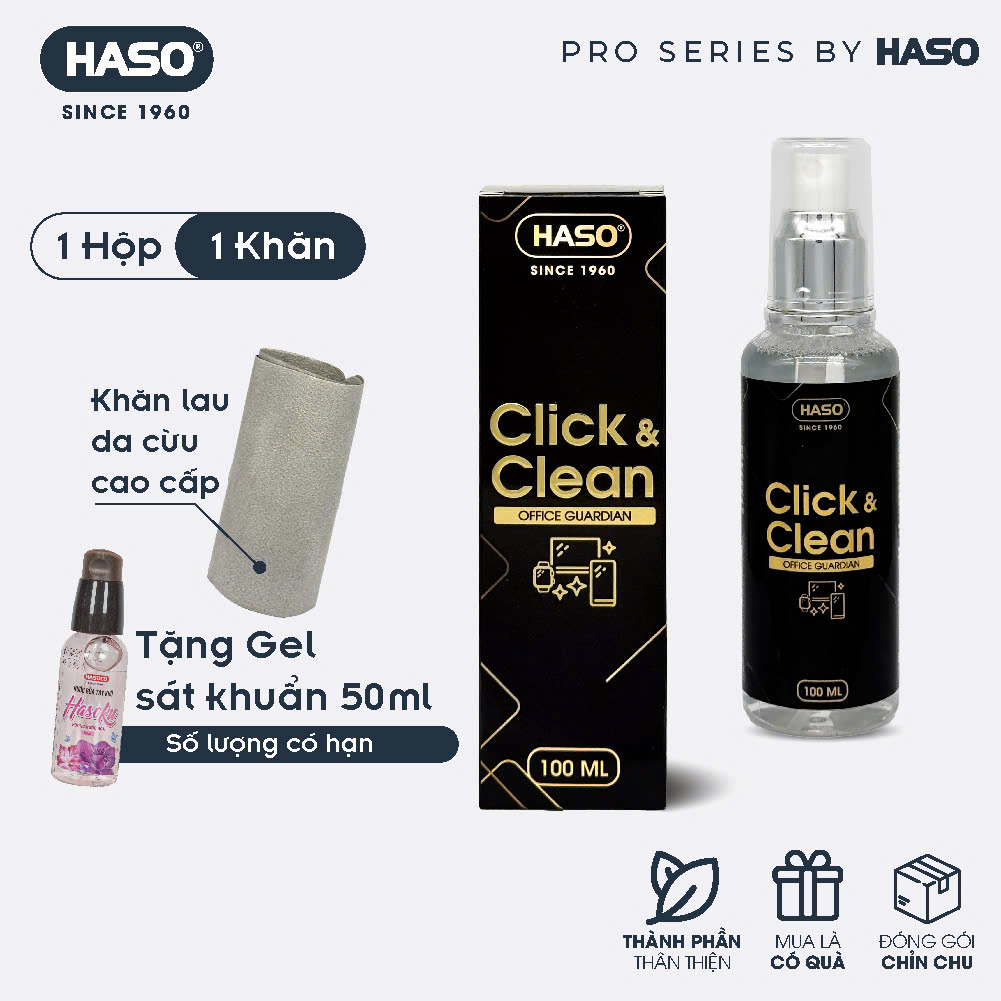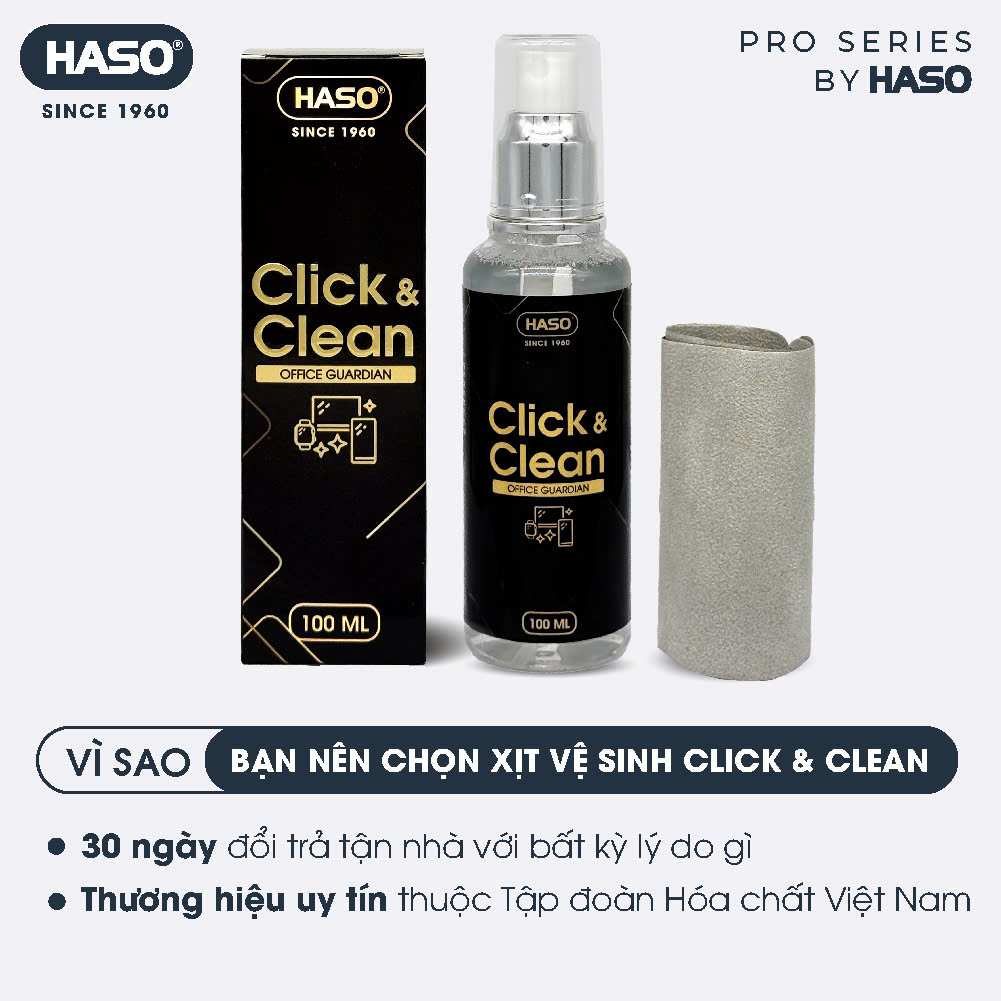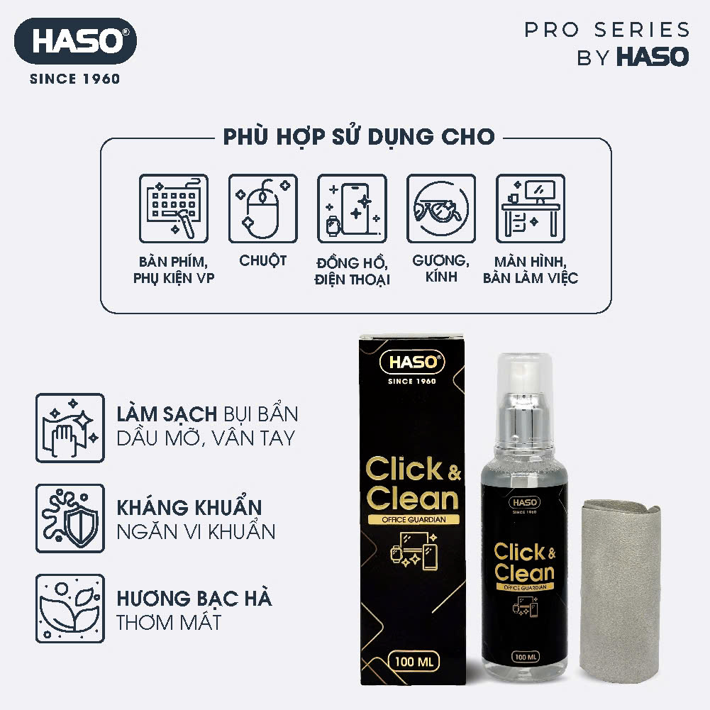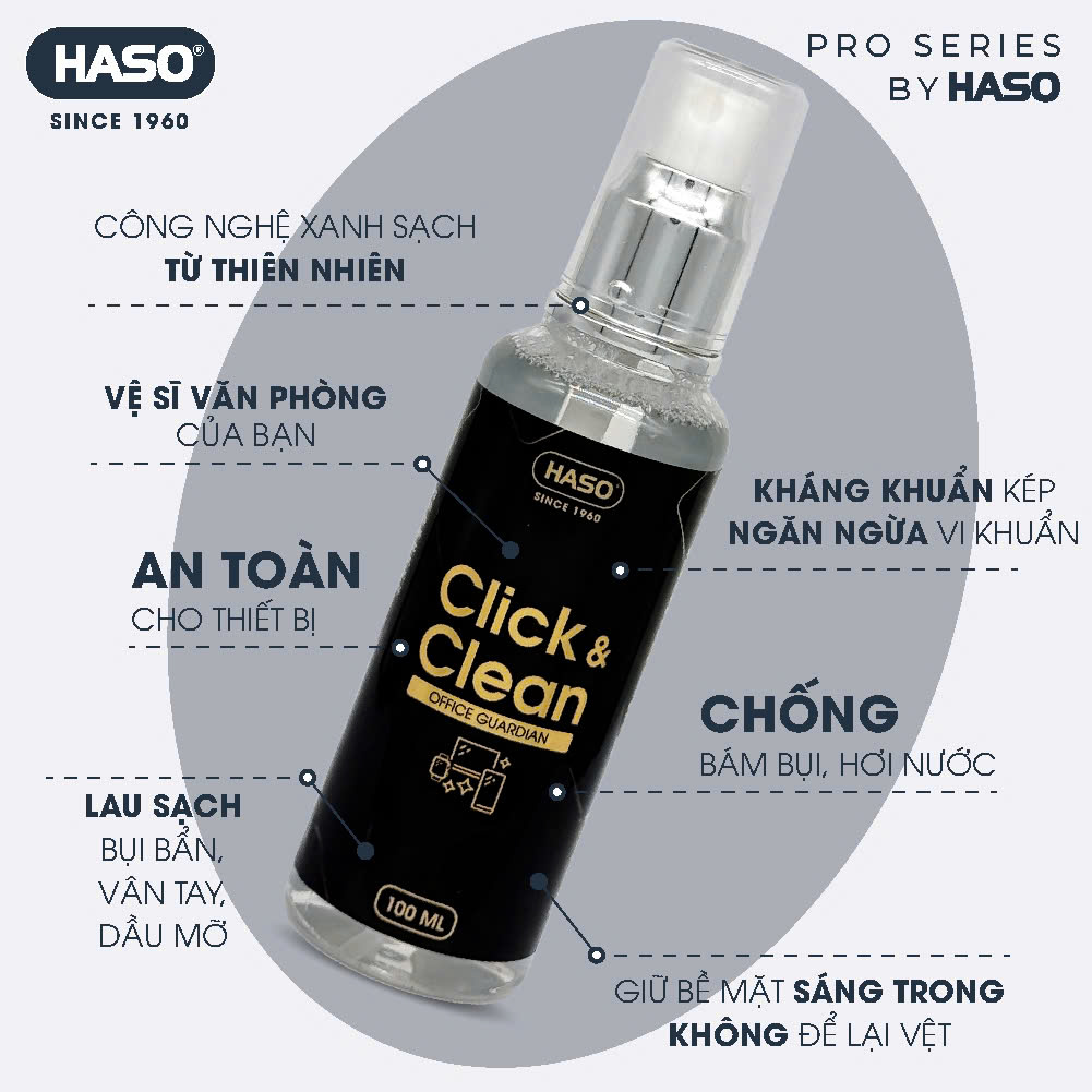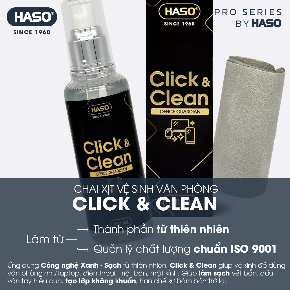 HASO Click&Clean là sản phẩm dung dịch dạng lỏng trong suốt, được nghiên cứu và phát triển nhằm đáp ứng nhu cầu vệ sinh chuyên biệt cho các thiết bị điện tử và bề mặt văn phòng. Sản phẩm phù hợp sử dụng trong văn phòng công ty, gia đình, trường học, trung tâm dịch vụ, góp phần nâng cao chất lượng môi trường làm việc và sinh hoạt.