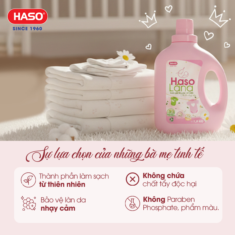 Việc lựa chọn sản phẩm giặt giũ phù hợp cho quần áo của trẻ nhỏ luôn là mối quan tâm hàng đầu của nhiều gia đình. Làn da của bé rất nhạy cảm, vì vậy một loại nước giặt vừa làm sạch hiệu quả vừa an toàn cho da là yếu tố quan trọng. Hiểu được nhu cầu đó, Công ty Cổ phần Xà phòng Hà Nội (HASO) đã nghiên cứu và phát triển Nước giặt dịu nhẹ HASO Lá Na cho mẹ và bé – sản phẩm ứng dụng công nghệ làm sạch từ nguồn gốc thực vật, giúp chăm sóc quần áo của bé một cách an toàn và nhẹ nhàng.