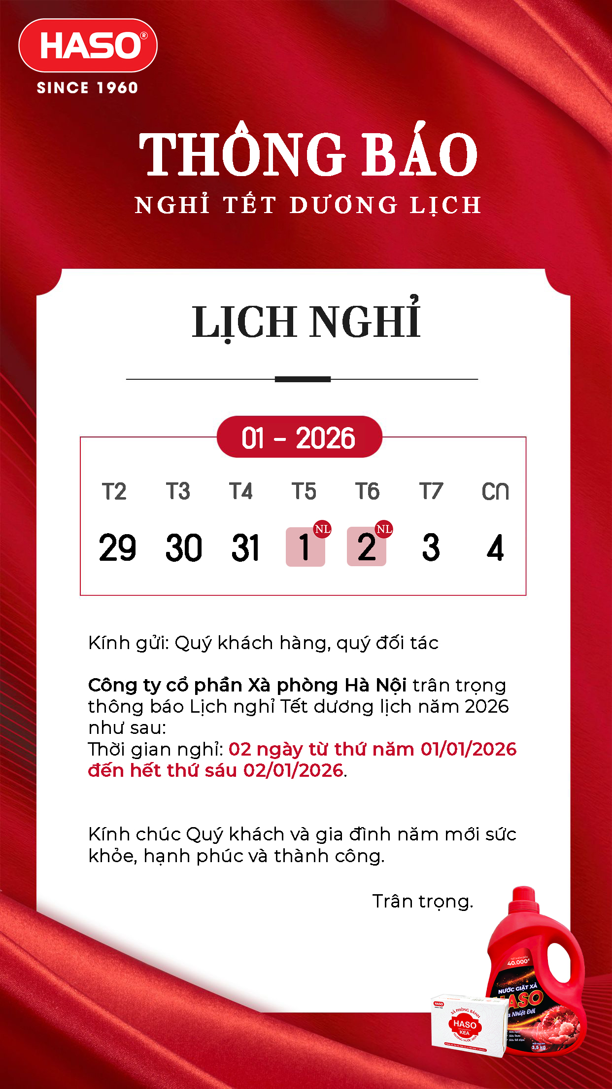 Căn cứ theo quy định của Nhà nước về chế độ nghỉ lễ và kế hoạch sản xuất – kinh doanh của Công ty, Công ty Cổ phần Xà phòng Hà Nội (HASO) trân trọng thông báo tới Quý đối tác, Quý khách hàng cùng toàn thể cán bộ, công nhân viên về lịch nghỉ Tết Dương lịch năm 2026 như sau: